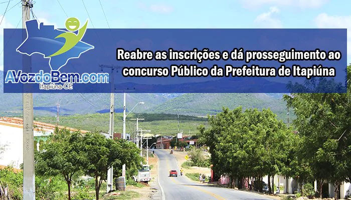 A Prefeitura Municipal de Itapiúna – CE, pessoa jurídica de direito público interno, neste ato representada pelo Exmo. Sr. Prefeito municipal FRANCISCO DÁRIO DE OLIVEIRA COELHO, no uso de suas atribuições legais, torna público o ADITIVO 05 ao EDITAL 001/2018 que reabre as inscrições e dá prosseguimento ao concurso público.