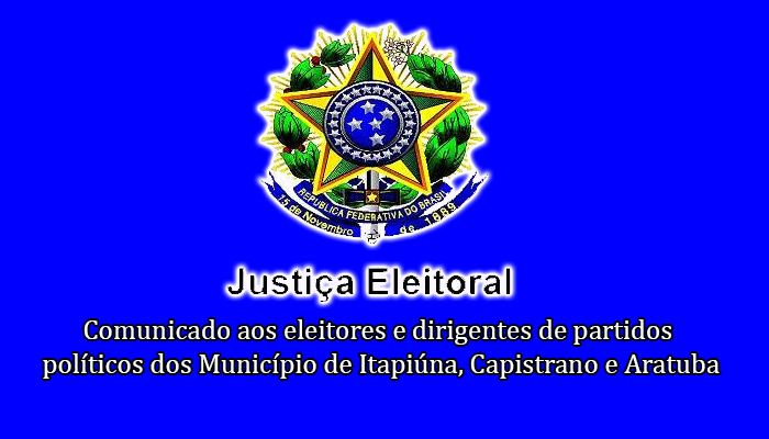 A Justiça Eleitoral da 105ª Zona de Capistrano comunica aos eleitores faltosos às três últimas eleições e aos partidos políticos dos municípios de Aratuba, Capistrano e Itapiúna que se encontra afixado, no Cartório Eleitoral da Zona de Capistrano – CE, o edital de nº 5/2019, dando publicidade da relação de eleitores que deixaram de votar nas três últimas eleições.