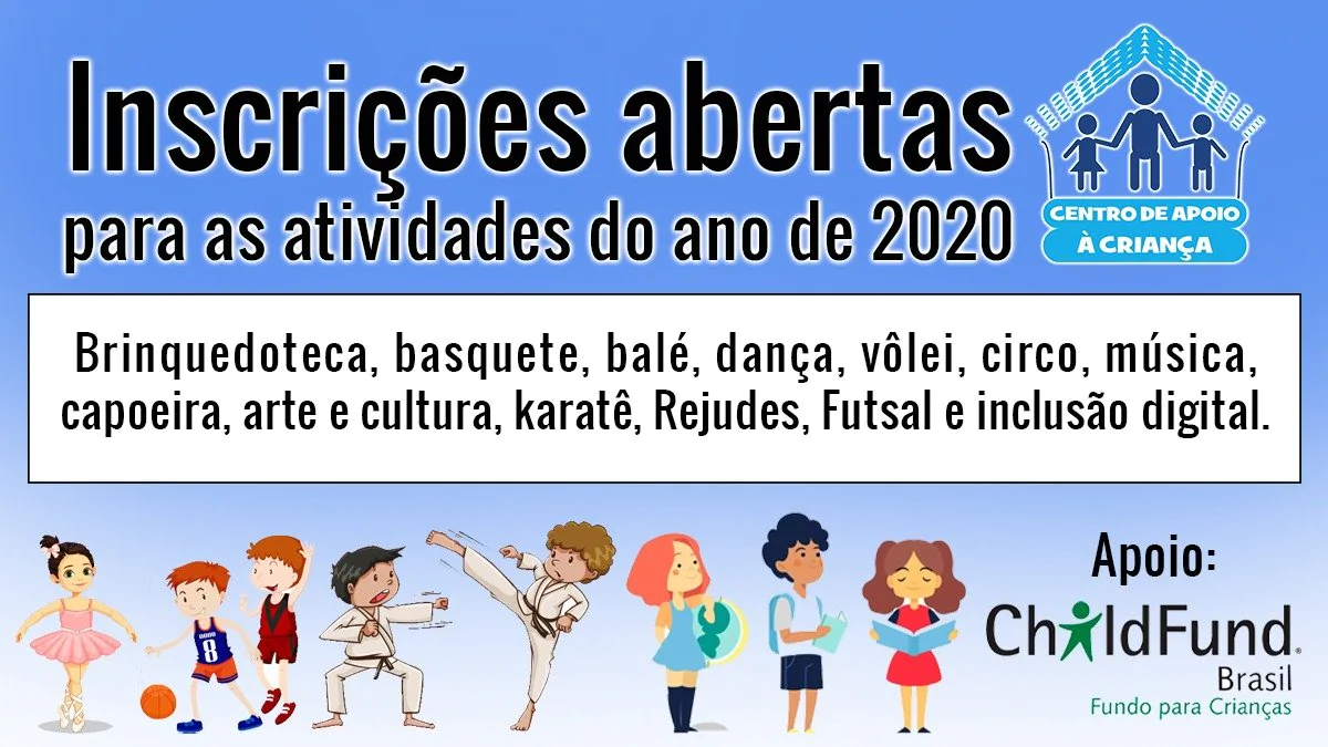 A Organização da Sociedade Civil (OSC) Centro de Apoio à Criança – CEACRI está com as inscrições abertas para as seguintes atividades: Brinquedoteca, basquete, balé, dança, vôlei, circo, música, capoeira, arte e cultura, karatê, Rejudes, Futsal e inclusão digital.