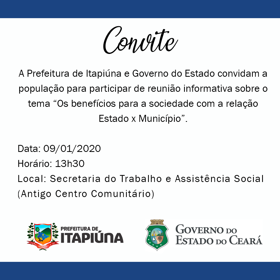A Prefeitura de Itapiúna e Governo do Estado convidam a população para participar de reunião informativa sobre o tema “Os benefícios para a sociedade com a relação Estado x Município”.