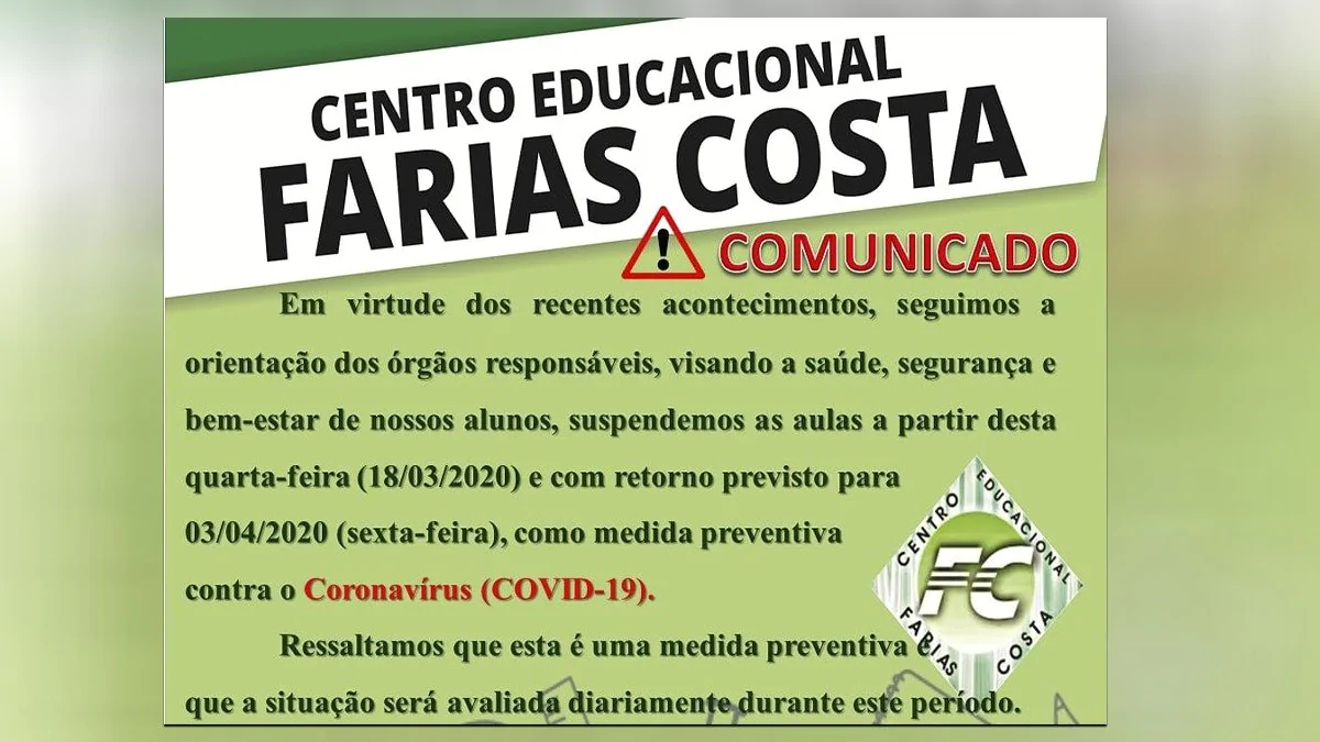 Centro Educacional Farias Costa suspende aulas como medida de prevenção ao Covid-19