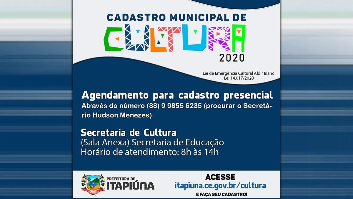 A Prefeitura de Itapiúna, através da Secretaria de Cultura, iniciou nesta segunda-feira, dia 03, o mapeamento de trabalhadores da área artística e cultural que serão beneficiados com o repasse de recursos da Lei Federal nº 14.017, de 30 de junho de 2020.
