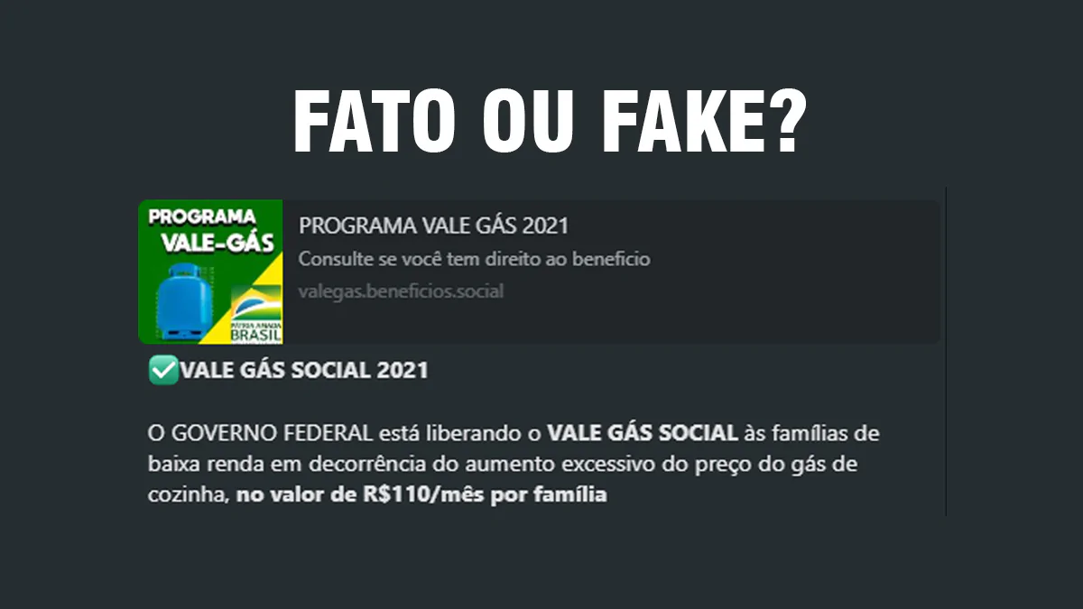 O Ministério da Cidadania alerta a população sobre a mensagem que circula nas redes sociais sobre suposto Vale Gás Social de R$ 90 ou R$ 110, que seria pago a aposentados, pensionistas e beneficiários do Bolsa Família e do Auxílio Emergencial. O BENEFÍCIO NÃO EXISTE. NÃO clique em links duvidosos e certifique-se sempre de verificar as informações nos canais oficiais do Governo Municipal, Estadual e Federal ou imprensa. Não forneça dados pessoais.
