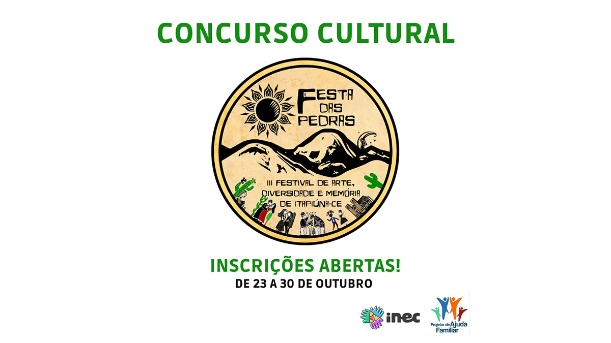 O Instituto Nordeste Cidadania (Inec) em parceria com o Projeto de Ajuda Familiar (PAF) Caio Prado lança o Concurso Cultural Festa das Pedras, em alusão a 3ª edição do Festival de Arte, Diversidade e Memória de Itapiúna. Em 2021 o tema será “Cultura, a força da nossa gente”.