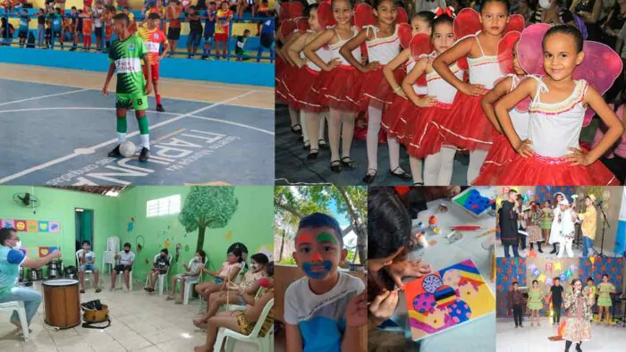 Arte Cultura e Muay thai (segunda), brinquedoteca (terça), balé e futsal (quarta), brinquedoteca e casinha de cultura (quinta), remoto (sexta).